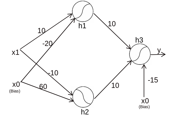 The above equation is satisfied only when both h1 and h2 values evaluate to one. That means this node with the weight and bias values of 10 and -15 respectively acts as an AND gate